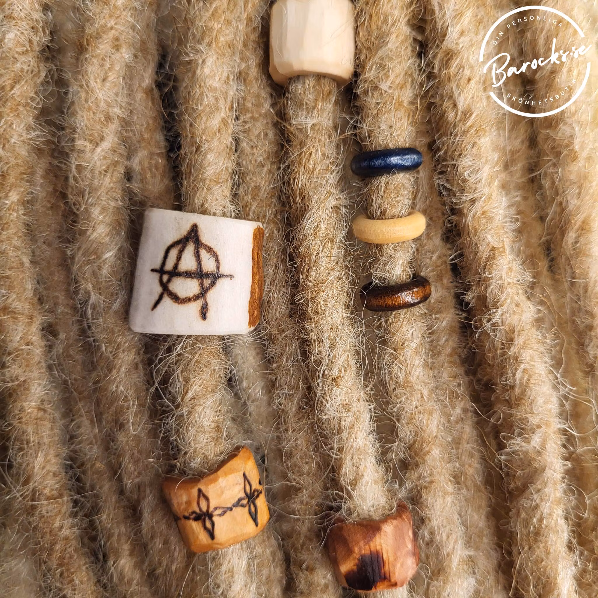 Dreadpärlor tillverkade av olika material – t.ex. ben / horn / trä