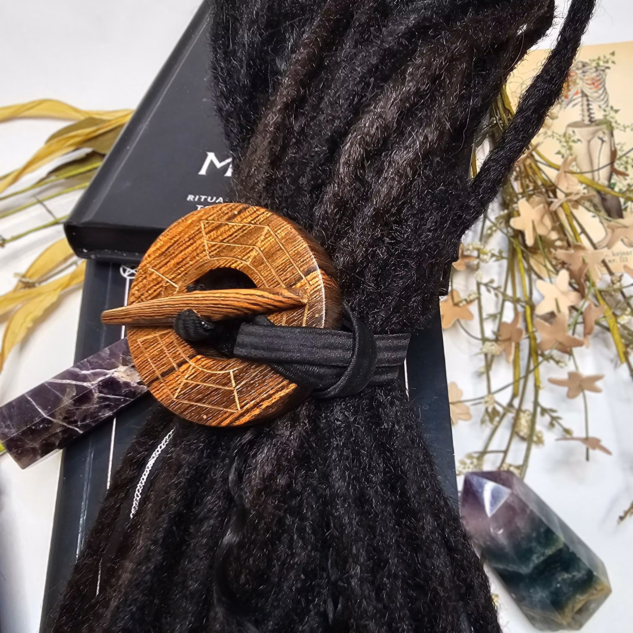 Här är en stor dreadsknapp med graverad design av ett spindelnät mönster.