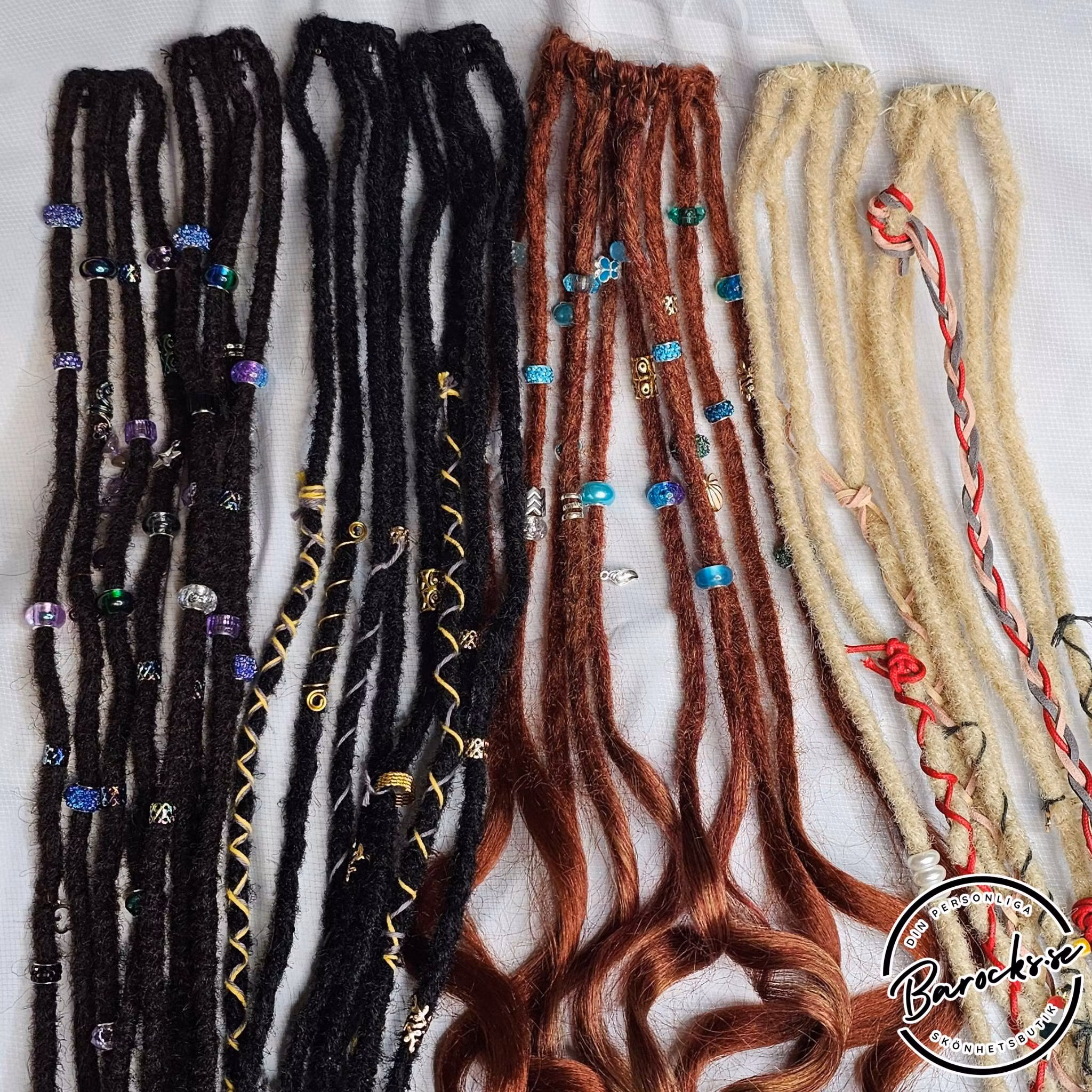 Vi dekorerar syntetdreadsen själva och varje set är sammansatta av oss personligen. Vi gör alltid varje set unikt så ingen annan är likadan!